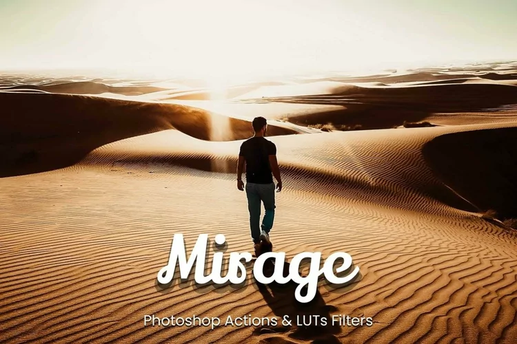 Enhance your Sahara and desert photos with 30 Mirage Photoshop actions and video LUTs. Transform landscapes, travel adventures, and nature shots with mesmerizing effects and vibrant themes.