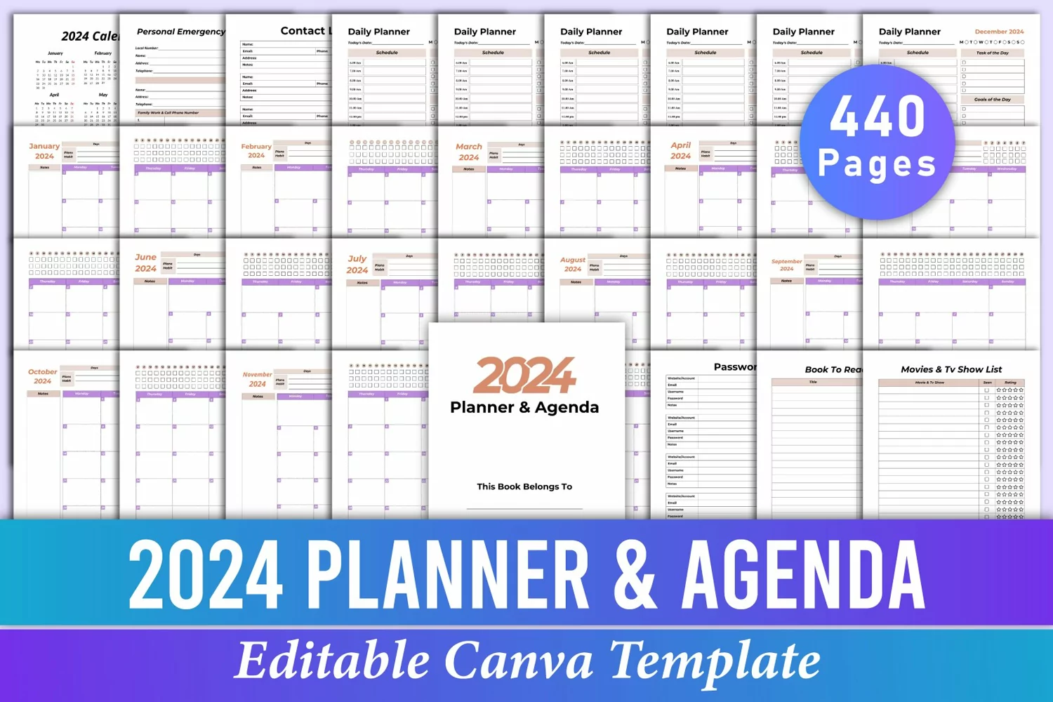 Editable 2024 Planner & Agenda Canva Interior. Each Template is Editable on Canva so you can change text, colors, fonts, and layout style. Editable Canva Link you can Customize it based on your requirement.