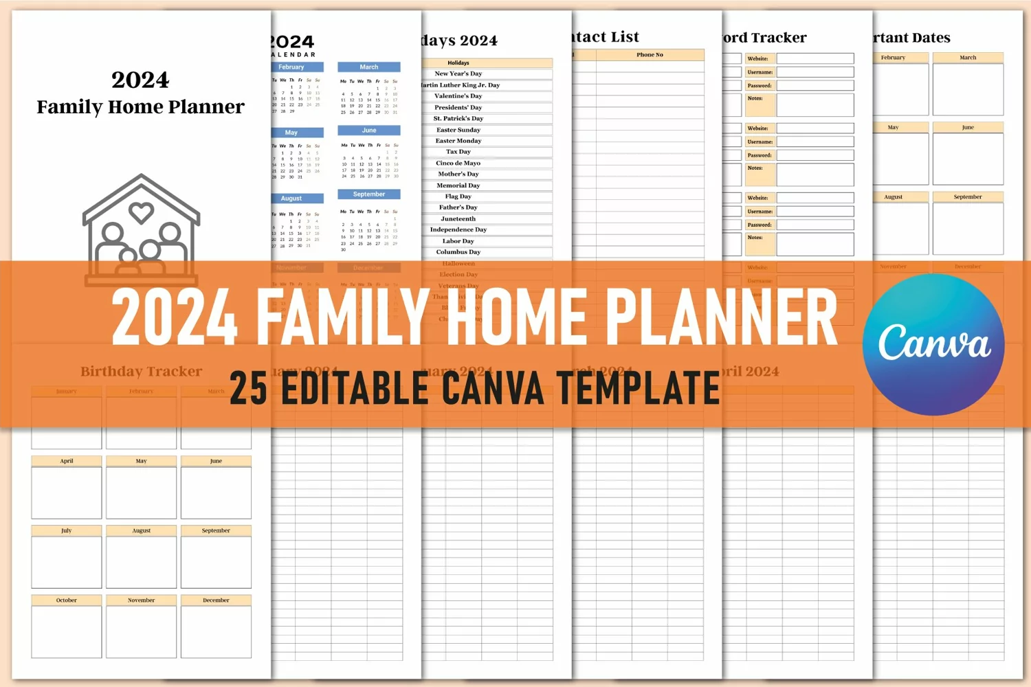 Editable 2024 Family Home Planner For Canva, you will receive high quality print ready PDF File with JPG File & PNG File