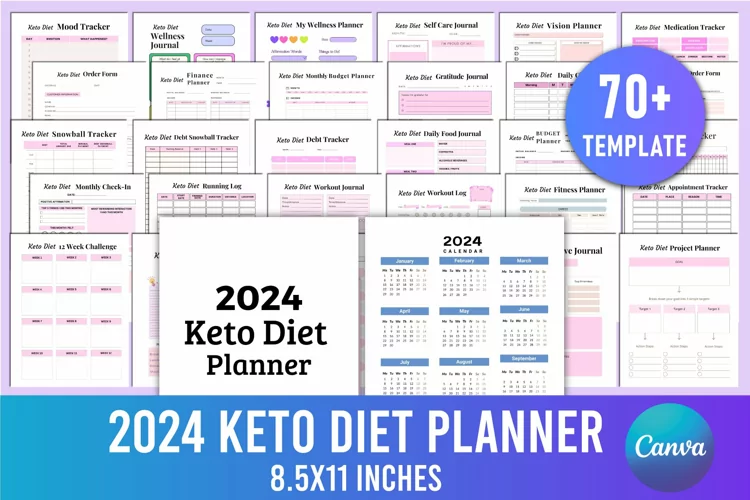 Editable 2024 Keto Diet Planner For Canva, you will receive high quality print ready PDF File with JPG File & PNG File