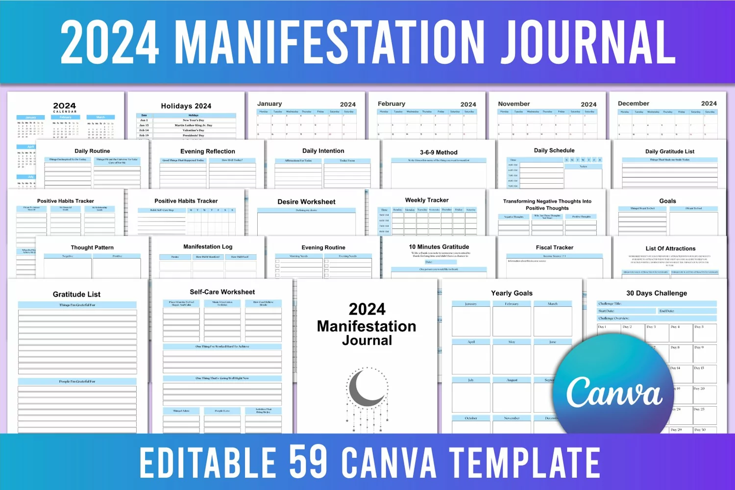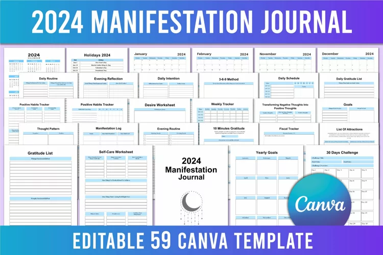 Editable 2024 Manifestation Journal For Canva, You will receive high quality print ready PDF File with JPG File & PNG File
