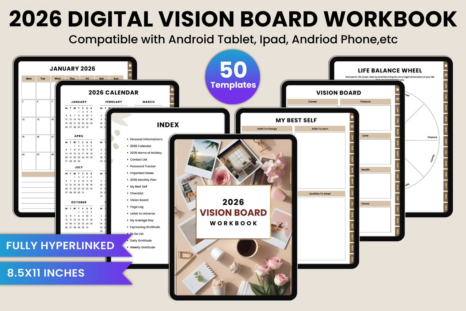 The "2026 Digital Vision Board Workbook" is a comprehensive productivity and self-development tool designed to help you visualize your goals, stay organized, and manifest success. Featuring structured monthly and yearly planners, self-care and habit trackers, gratitude pages, and customizable vision board templates, it empowers you to stay focused, balanced, and motivated throughout the year. Each Template is Editable on Canva so you can change text, colors, fonts, and layout style.