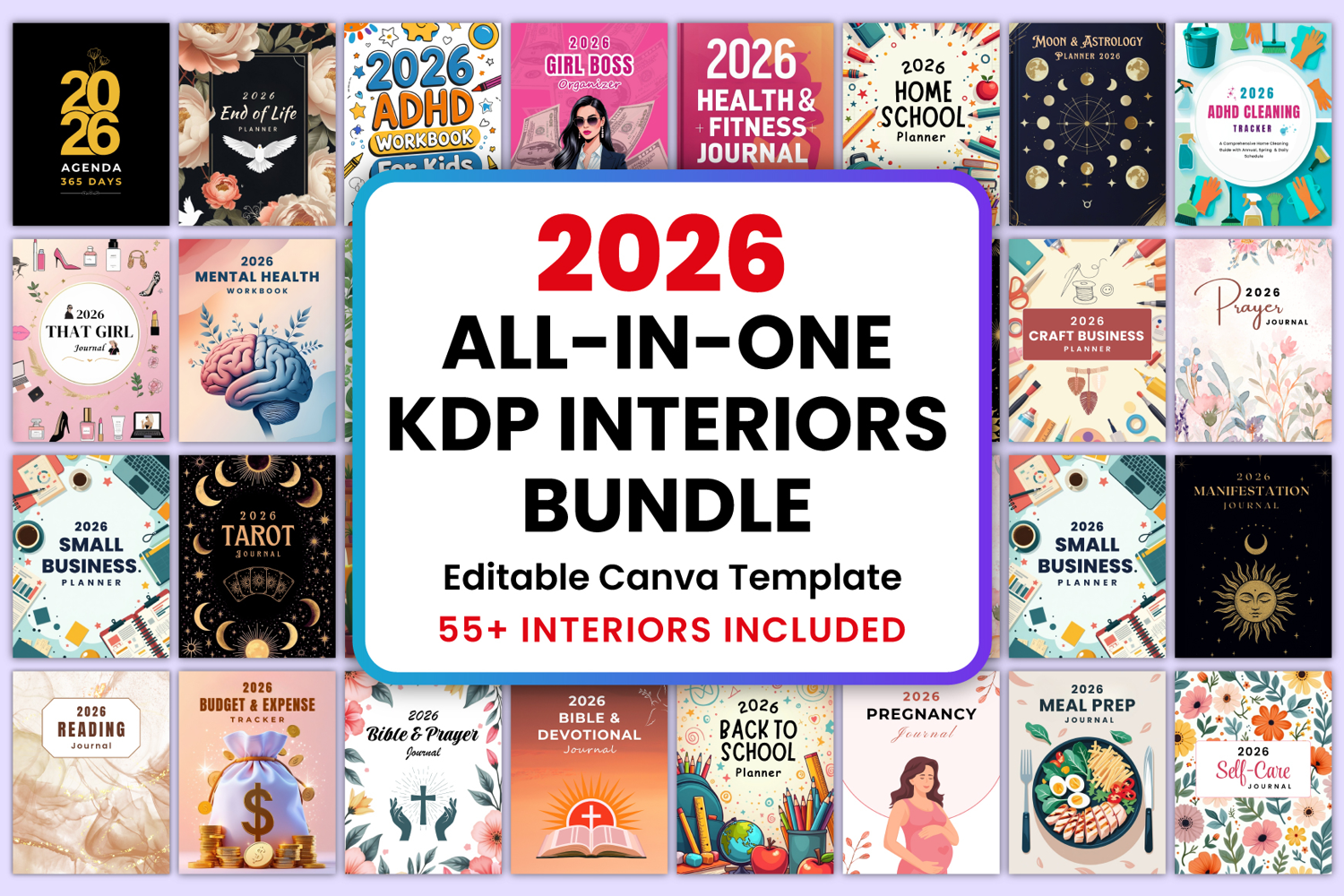 2026 All-in-One KDP Interiors Bundle. Stay perfectly organized and inspired throughout 2026 with this ultimate collection of printable planners, journals, and trackers — designed to support every aspect of your life. From daily organization to emotional healing, this bundle offers thoughtful layouts for planners, self-care, faith, and business growth. This bundle includes the best 55+ Editable Canva KDP interior for 2026, offering a wide range of designs for journals, planners, and more. By purchasing this bundle, you’ll save time on design and a significant amount of money compared to buying individual templates. Each Template is Editable on Canva so you can change text, colors, fonts, and layout style.