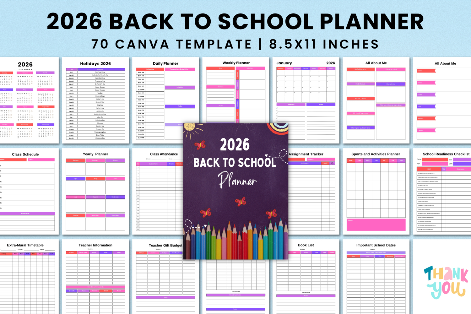 2026 Back To School Planner for Canva,Get organized and ready for the school year with this Back to School Planner! Perfect for students, parents, and teachers, this planner includes class schedules, homework trackers, goal-setting pages, and more to help make the academic year a success. Stay on top of your tasks and plan with confidence!