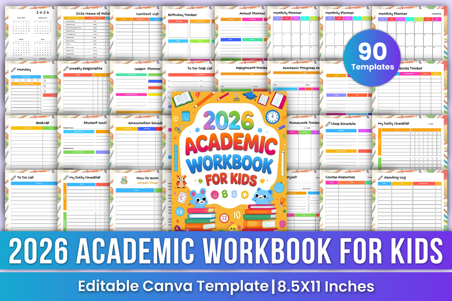 The "2026 Academic Workbook for Kids" is a complete yearly organizer designed to help students plan, learn, and stay motivated. It includes a 2026 calendar, holiday list, contact pages, and birthday tracker for organization. Students can manage their schedules through annual, monthly, weekly, and daily planners, track habits and assignments, and record academic progress with built-in goal sheets, lesson planners, and grade trackers. Each Template is Editable on Canva so you can change text, colors, fonts, and layout style. You will get High-Quality 8.5x11 Inches PDF Files.