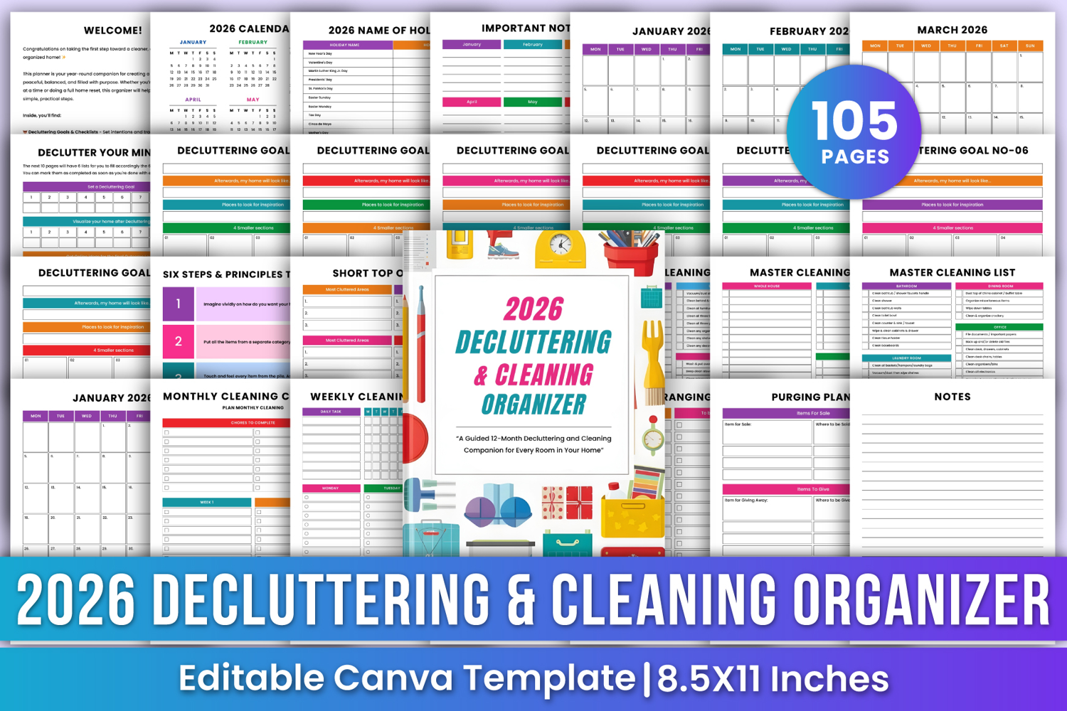 Take control of your home and mind with the 2026 Decluttering & Cleaning Organizer a beautifully structured printable planner designed to help you simplify, declutter, and maintain a stress-free living space all year long.This professional planner guides you step-by-step through every stage of your home organization journey from mindset preparation to monthly cleaning schedules. Each Template is Editable on Canva so you can change text, colors, fonts, and layout style. You will get High-Quality 8.5x11 Inches PDF Files.