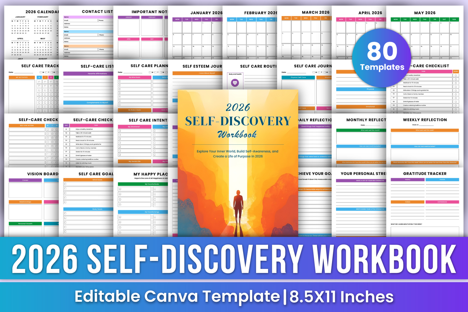 The 2026 Self-Discovery Workbook is your all-in-one guided planner and mindfulness journal for living intentionally. Thoughtfully designed for women who desire clarity, balance, and peace, this printable workbook combines goal setting, reflection, and emotional wellness tools to help you thrive all year long. Each Template is Editable on Canva so you can change text, colors, fonts, and layout style. You will get High-Quality 8.5x11 Inches PDF Files.