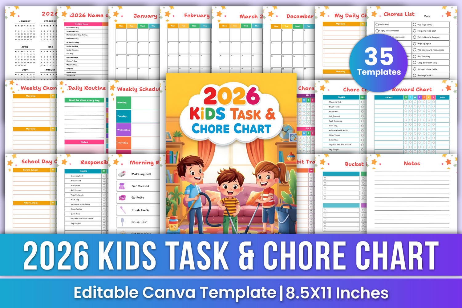 The "2026 Kids Task & Chore Chart" is a child-friendly planner that helps kids build habits, stay on track, and manage daily routines. This editable Canva template includes calendars, weekly and daily planners, checklists, chore and behavior trackers, reward charts, and more. Fully customizable and print-ready, it makes staying organized fun and easy for kids. Each Template is Editable on Canva so you can change text, colors, fonts, and layout style. Editable Canva Link you can Customize it based on your requirement. You will get High-Quality Print Ready 8.5x11 Inches PDF files.