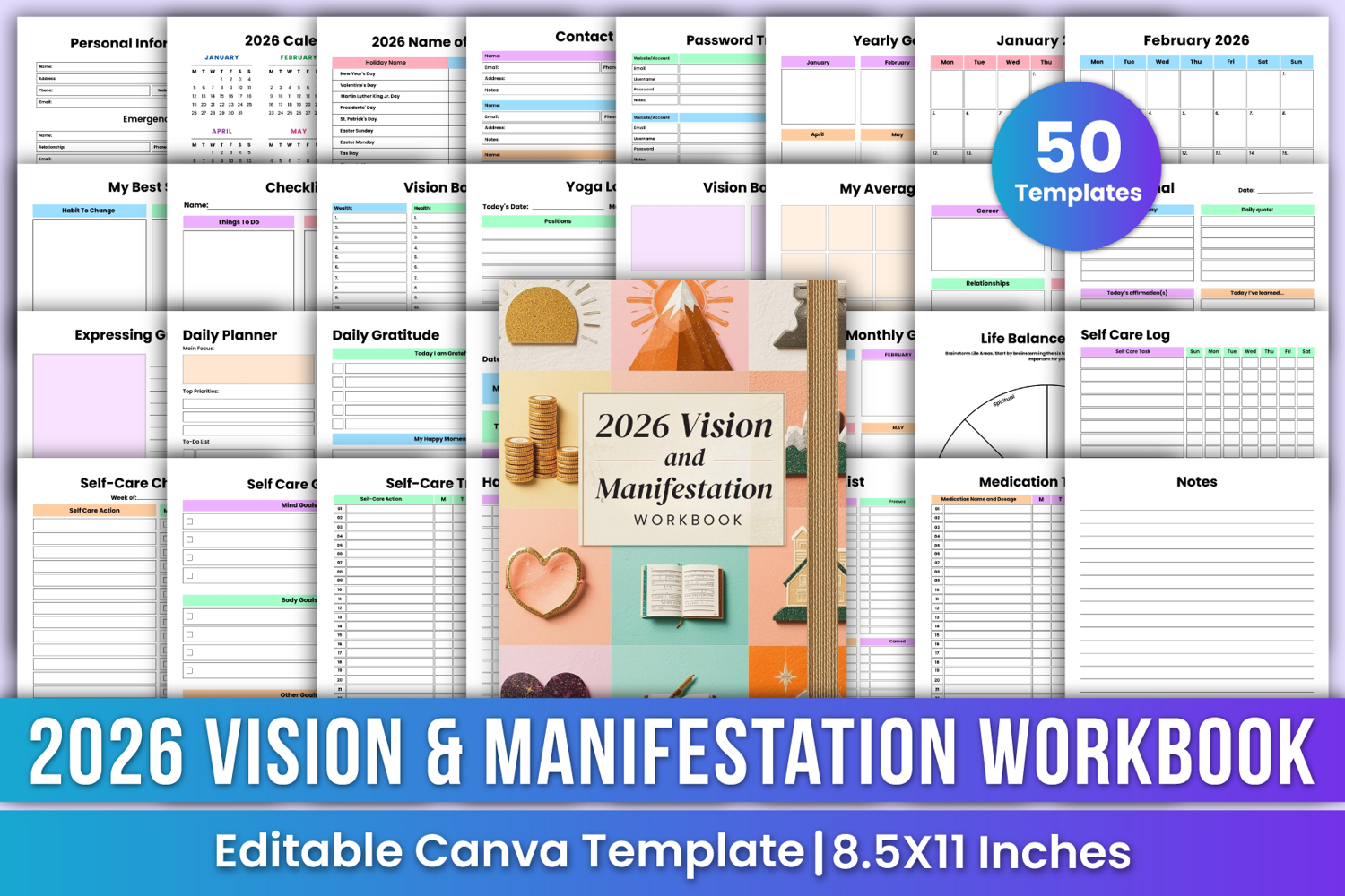 The "2026 Vision & Manifestation Workbook" is a guided planning system designed to help you clarify your goals, set aligned intentions, and stay focused throughout the year. Featuring practical planning pages, mindset worksheets, and manifestation tools, this workbook supports better habits, growth, and purposeful living in 2026. Each Template is Editable on Canva so you can change text, colors, fonts, and layout style. Editable Canva Link you can Customize it based on your requirement. You will get High-Quality Print Ready 8.5x11 Inches PDF files.