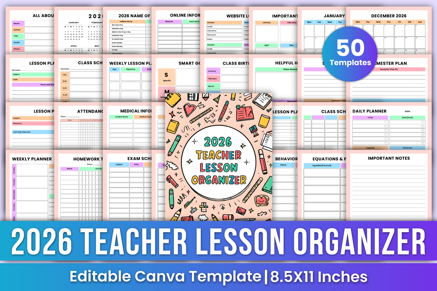 The 2026 Teacher Lesson Organizer is a complete, easy-to-use planning system designed to help teachers stay organized and productive throughout the school year. It includes yearly, monthly, weekly, and daily planning pages, lesson templates, class management tools, academic logs, and essential teacher resources all in one place. Each Template is Editable on Canva so you can change text, colors, fonts, and layout style. Editable Canva Link you can Customize it based on your requirement. You will get High-Quality Print Ready 8.5x11 Inches PDF files.