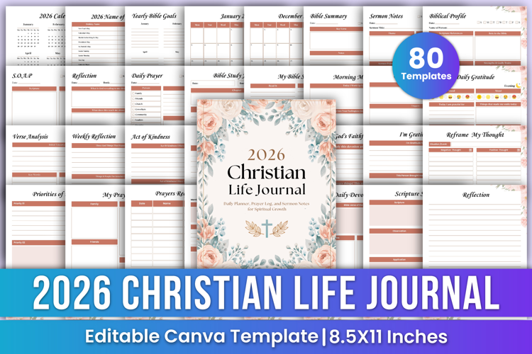 The “2026 Christian Life Journal” offers a structured, faith-centered system for daily devotion, prayer, gratitude, and Bible study. With monthly planners, reflection pages, sermon notes, prayer logs, and SOAP worksheets, it helps you stay spiritually focused throughout the year. Each Template is Editable on Canva so you can change text, colors, fonts, and layout style. Editable Canva Link you can Customize it based on your requirement. You will get High-Quality Print Ready 8.5×11 Inches PDF files.
