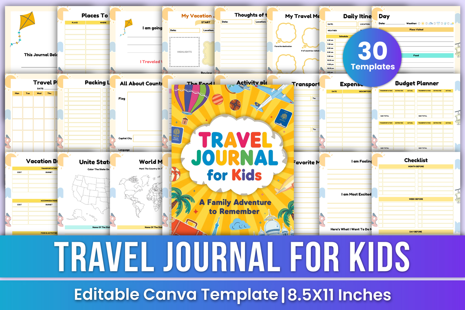 A fun and simple Travel Journal for Kids to record daily adventures, activities, memories, and trips. Includes itineraries, maps, packing lists, and activity pages perfect for any vacation. Each Template is Editable on Canva so you can change text, colors, fonts, and layout style. Editable Canva Link you can Customize it based on your requirement. You will get High-Quality Print Ready 8.5X11 Inches PDF File.