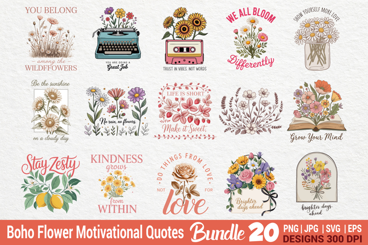 Boho Retro Flowers Motivational Quotes Bundle