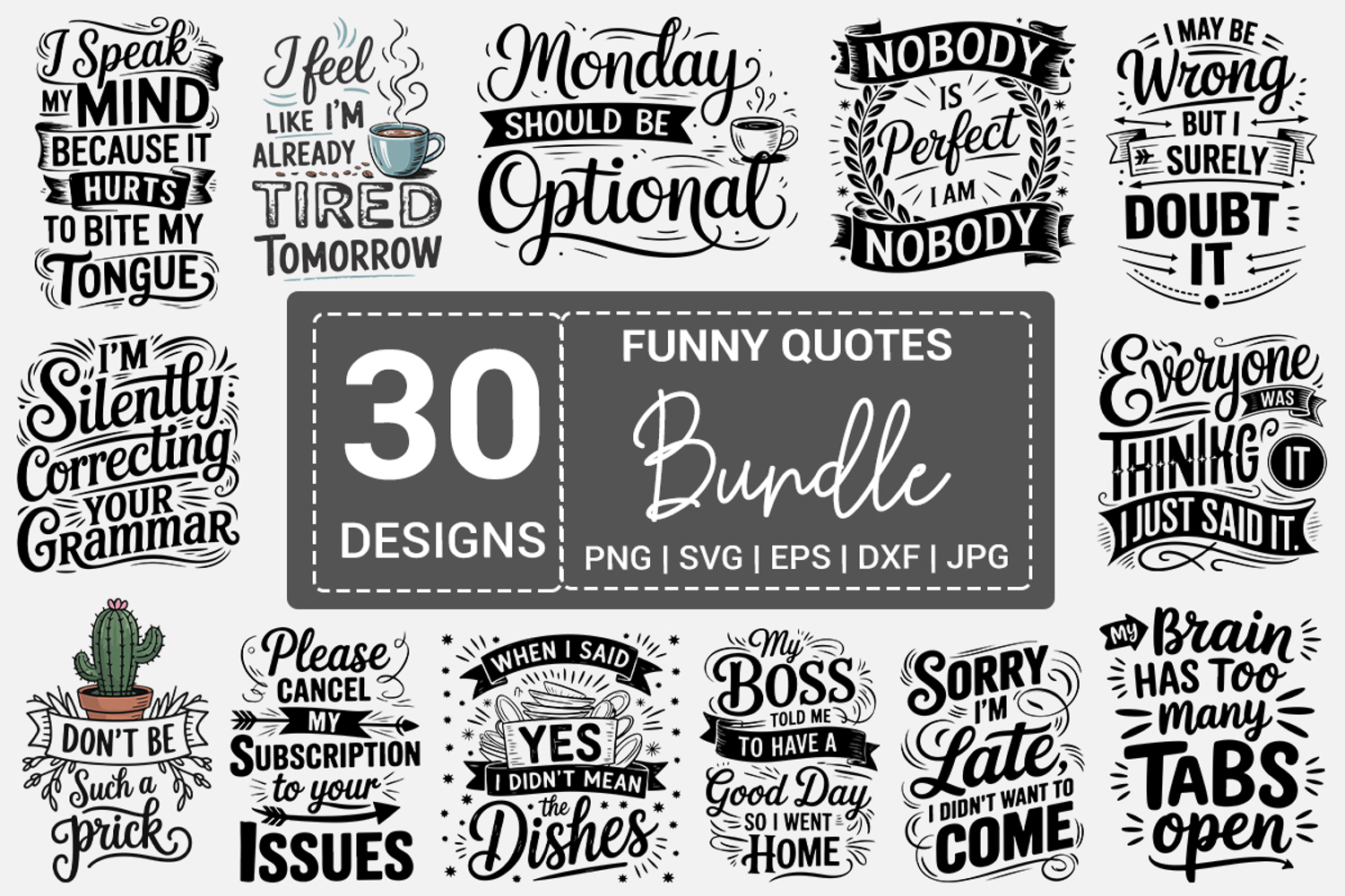 Funny Quotes Typography Svg Png Eps Dxf Bundle Black And White Funny Saying Design Pack Witty Quote Typography T-shirt Design Set Sarcastic Humor Quote Svg Bundle For Cricut And S Minimalist Funny Quote Printable Wall Art Modern Black And White Quote Design Collection Funny Text Typography Cut File Pack Humorous Saying Design Bundle For Sublimation Relatable Quote Svg Png Eps Digital Download Funny Sarcastic Quotes Svg Png Bundle
