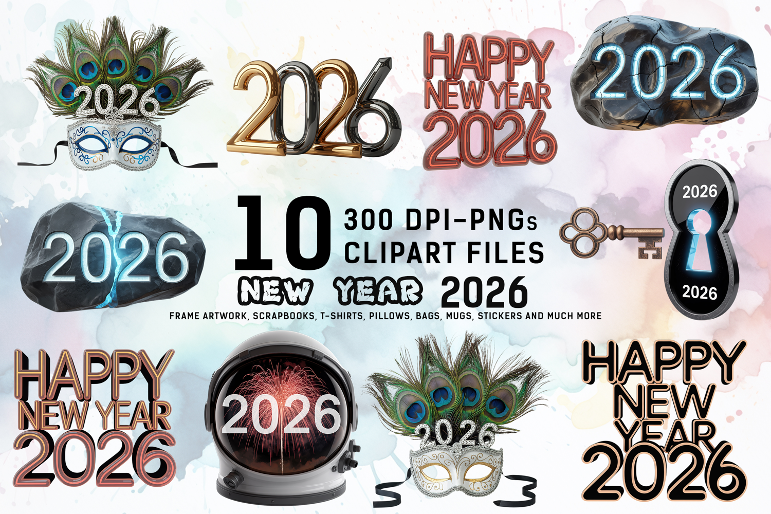 Ring in the new year with this festive 10-piece New Year's Eve 2026 PNG clipart collection. This unique bundle is packed with a variety of designs, from a celebratory peacock masquerade mask and sleek 3D metallic "2026" numbers to a futuristic astronaut helmet with fireworks inside. The collection also includes a glowing "2026" on a rock, and a key unlocking the new year with a "2026" keyhole.