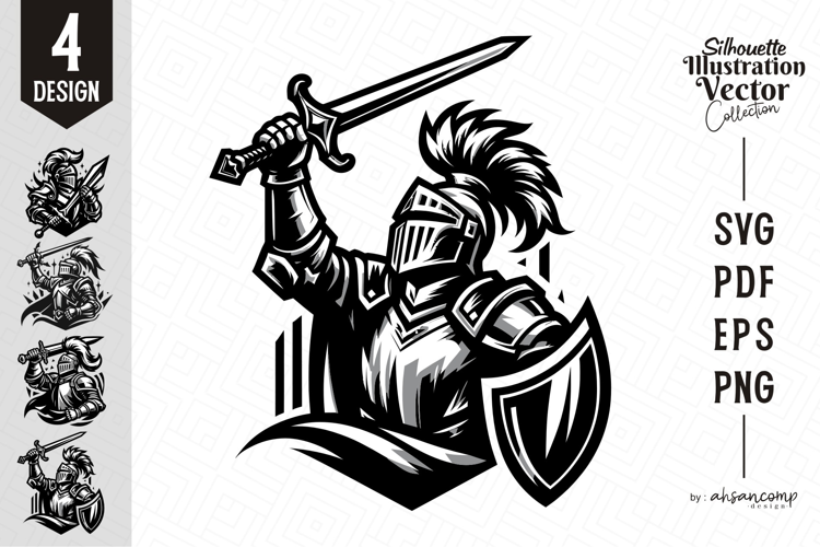 Set of black and white knight silhouette illustrations featuring medieval warriors in armor holding swords and shields. Perfect for logo design, esport mascots, vintage badges, or medieval-themed artwork. Available in SVG, PDF, EPS, and PNG formats for easy customization.