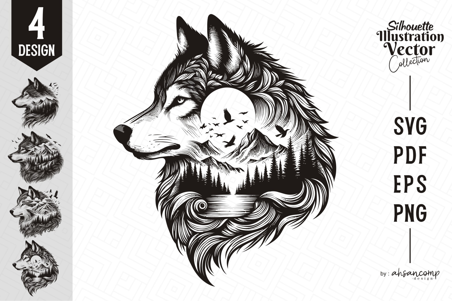 Detailed wolf silhouette illustration featuring a mountain and pine forest landscape in a vintage engraving style. This monochrome vector artwork combines wildlife and nature elements with bold line art and strong contrast. Perfect for t-shirt designs, tattoos, posters, logos, wall art, outdoor branding, and creative print projects. Available in SVG, EPS, PDF, and PNG formats.