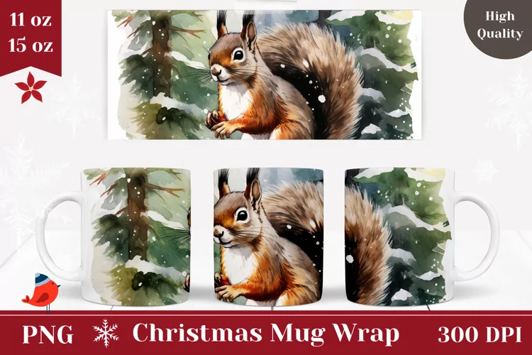 Watercolor Squirrel Mug Wrap Design, Christmas Coffee Cup