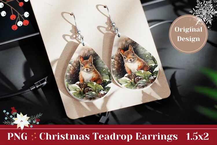 Christmas Earrings Sublimation , Winter Squirrel Sublimation example image 1