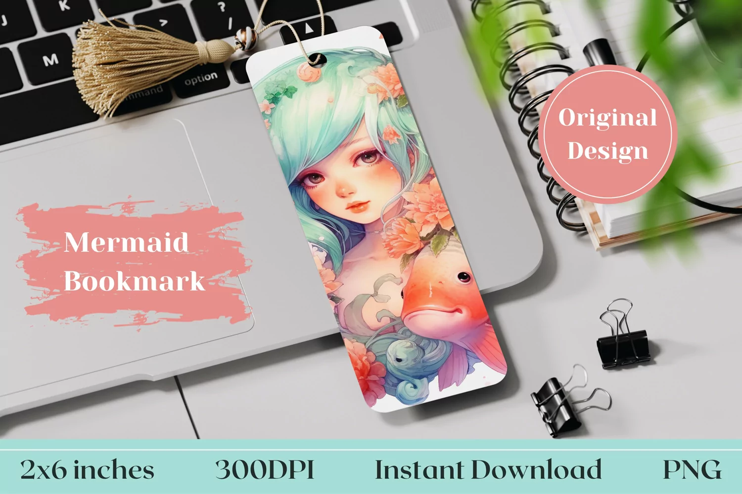 Mermaid Bookmark Template, Kawaii Mermaid Sublimation Design