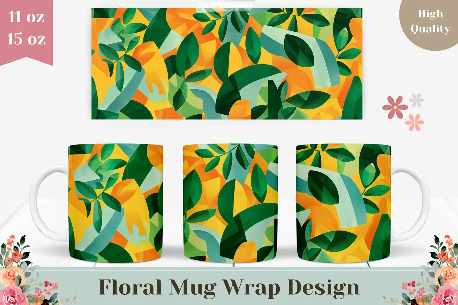 Floral Mug Wrap Design, Abstract Summer Mug Sublimation