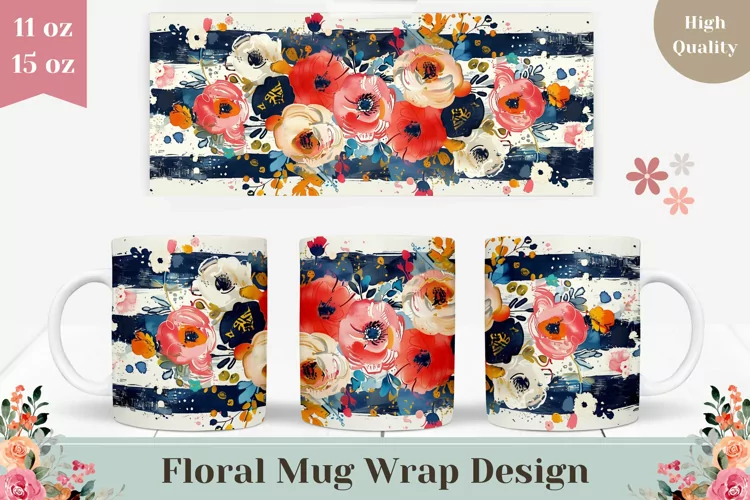 Watercolor Flowers Mug Wrap Design, Stripes Mug Template