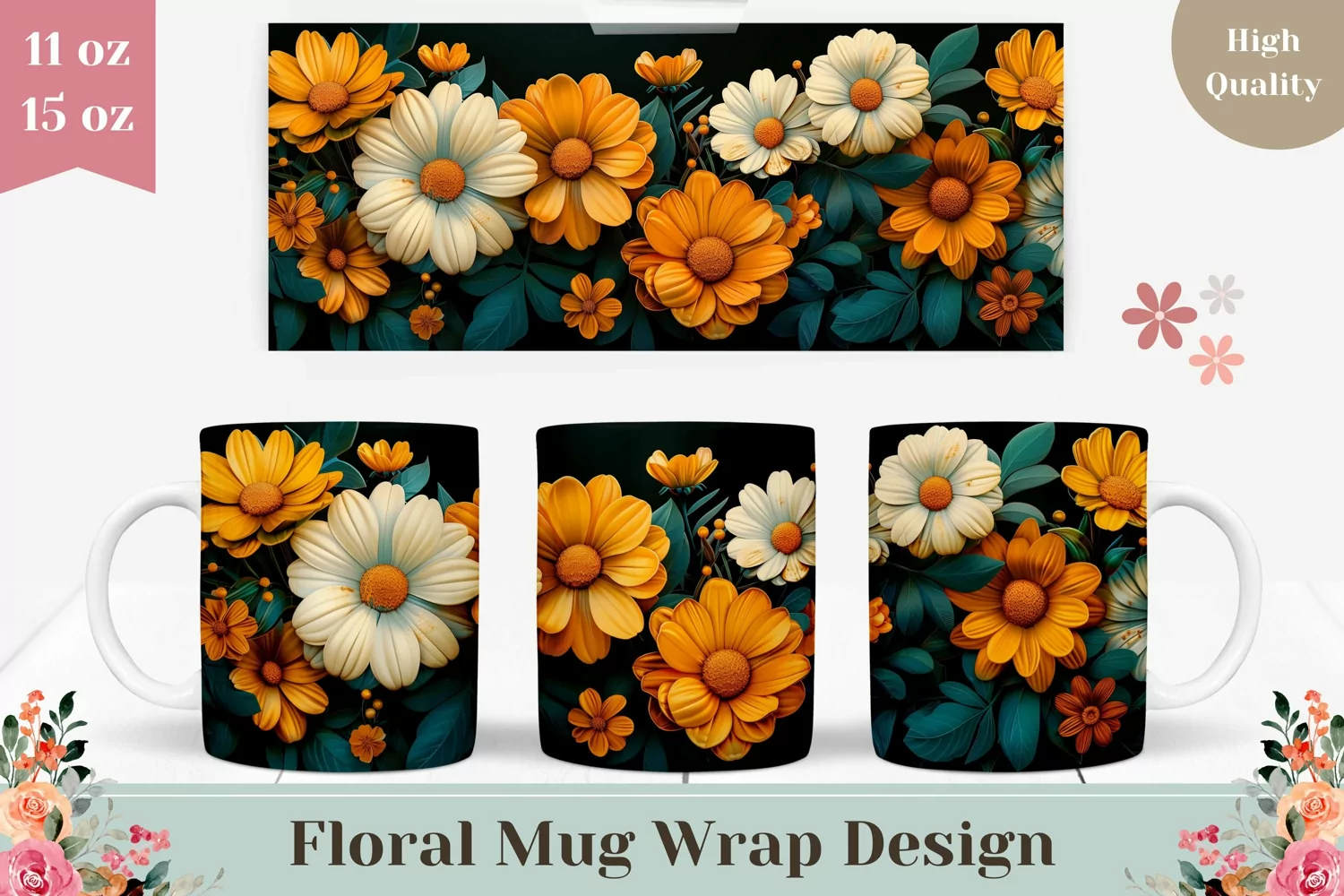 3D Flowers Mug Wrap Design, 3D Coffee Mug Template