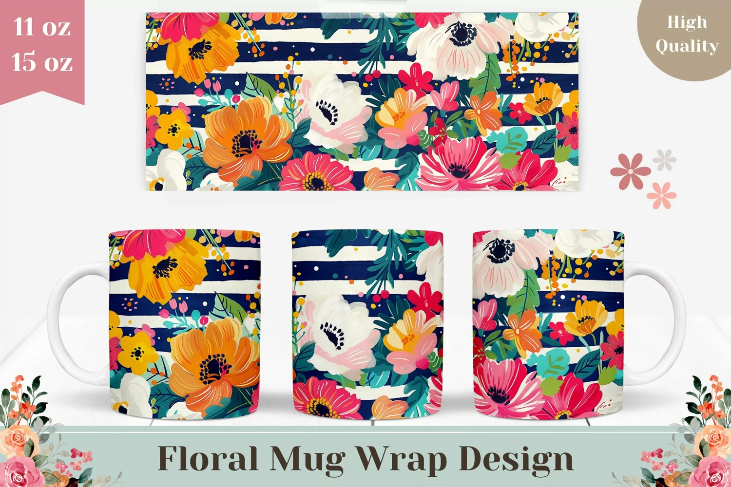 Watercolor Flowers Sublimation Mug, Stripes Mug Design