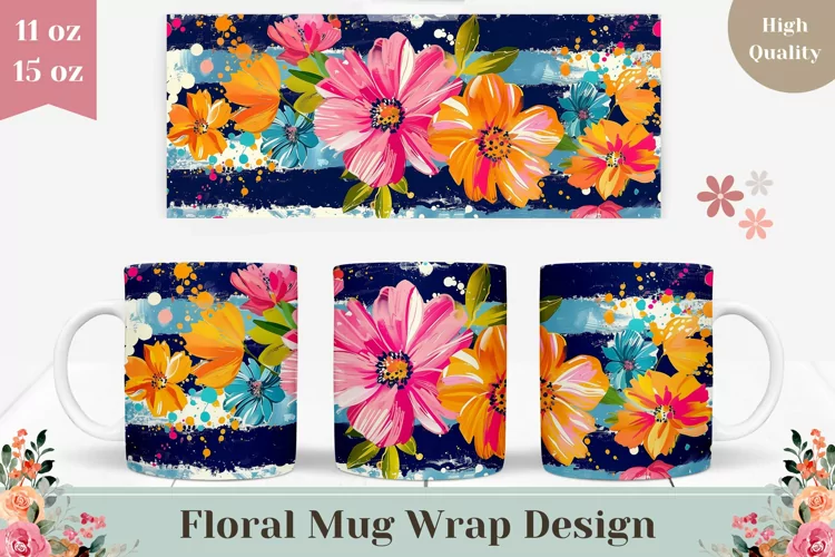 Watercolor Flowers Sublimation Mug, Stripes Mug Wrap Design