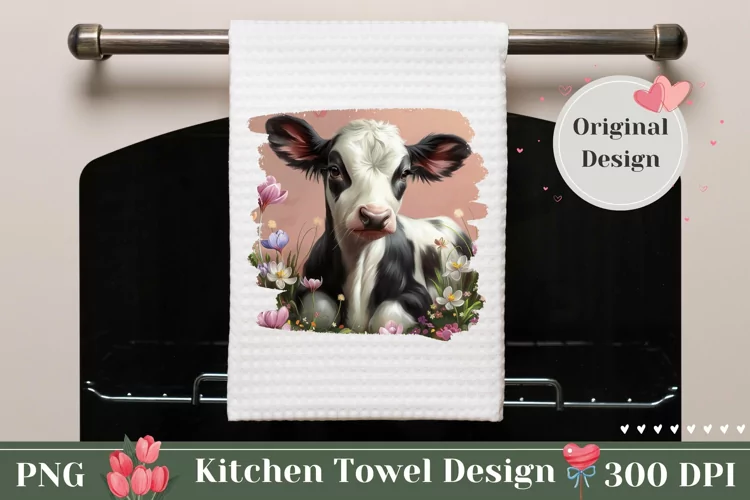 Cow Kitchen Towel Sublimation, Flowers Towel Design example image 1