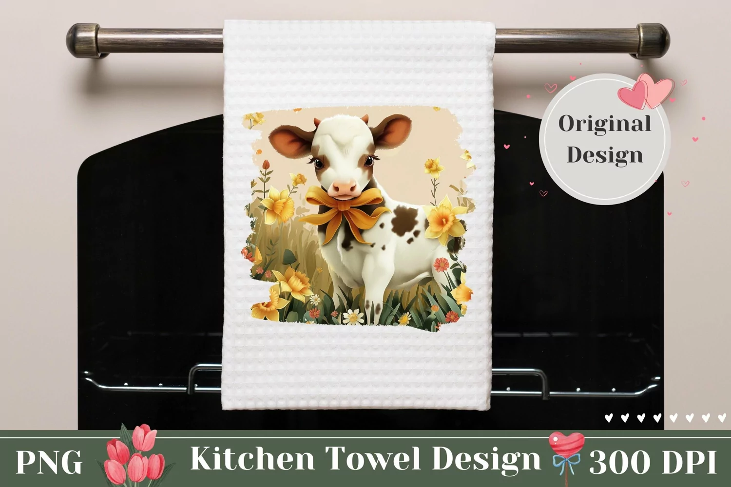 Cow Kitchen Towel Sublimation, Floral Towel Design example image 1