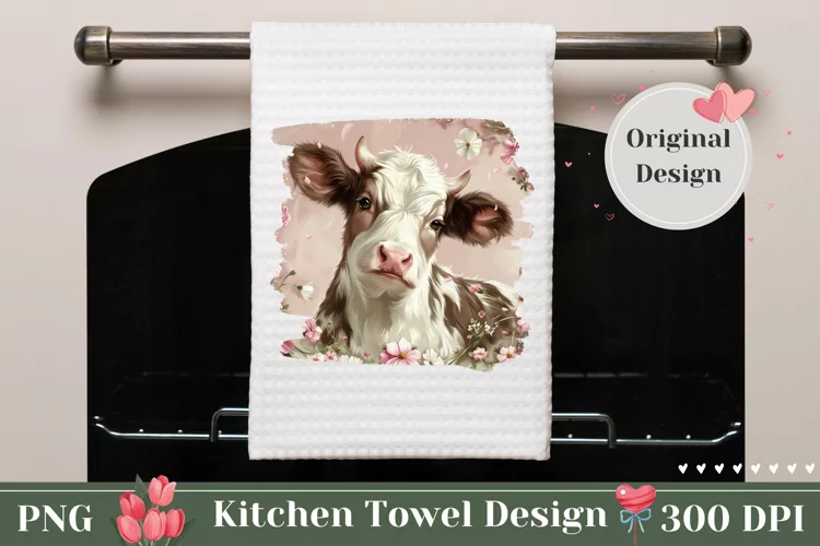 Cow Kitchen Towel Sublimation Design, Floral Towel PNG example image 1