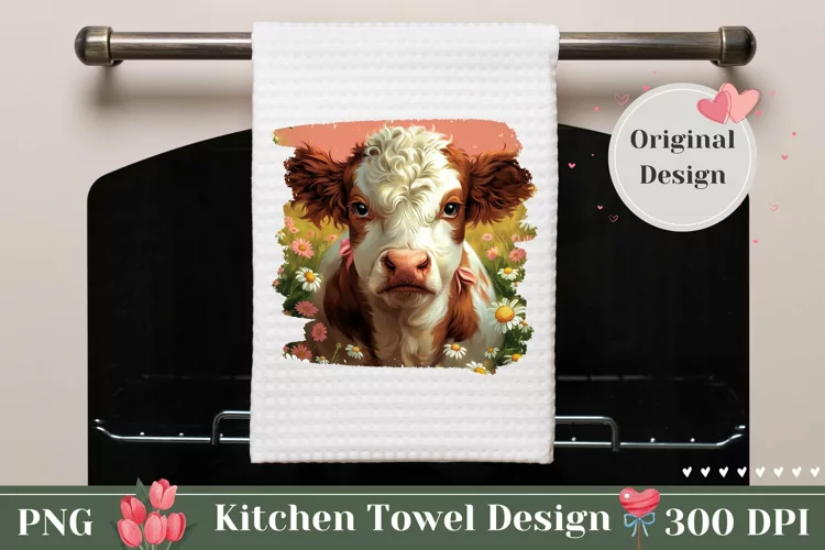 Cute Cow Kitchen Towel Template, Chamomile Towel Sublimation