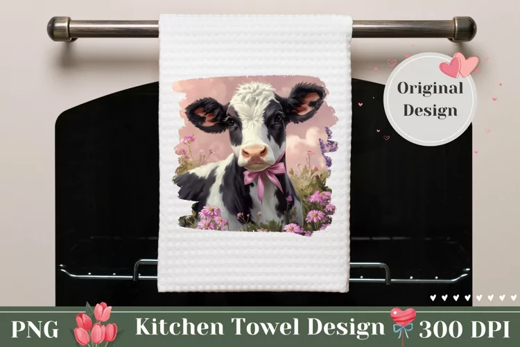 Cute Cow Kitchen Towel Template, Flowers Towel PNG example image 1