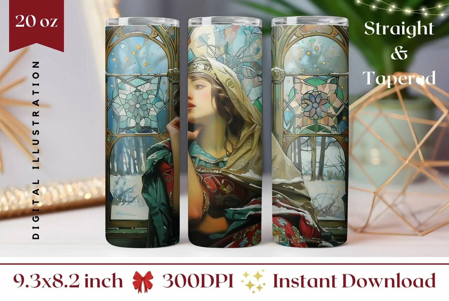 Christmas Sublimation Tumbler Wrap. Colorful sublimation design with Christmas Girl in Winter Forest.