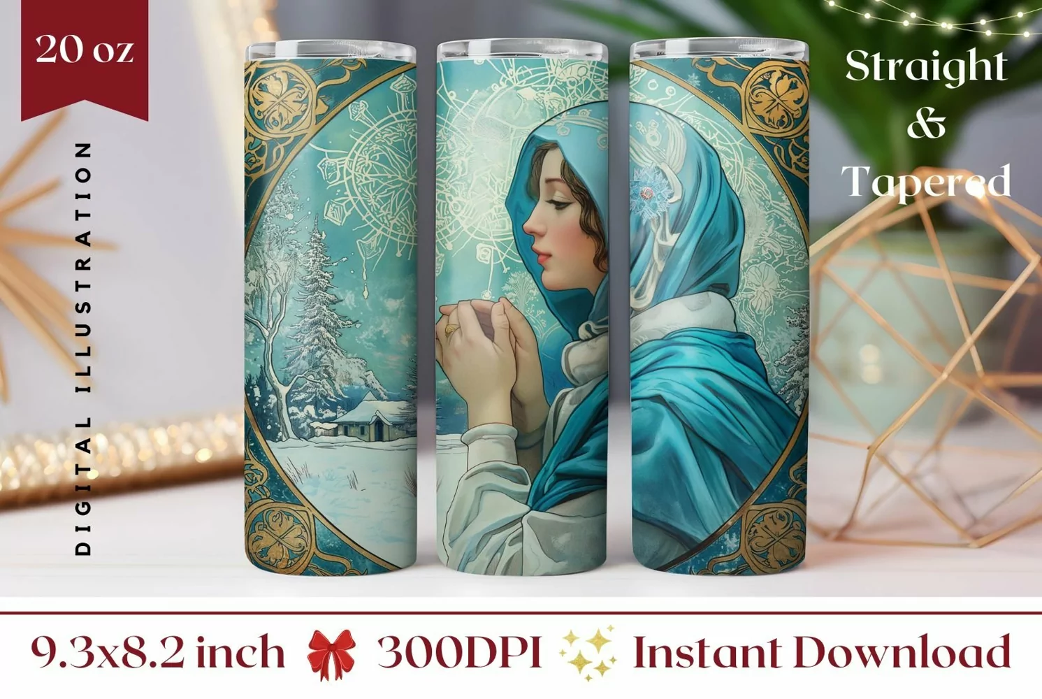 Christmas Sublimation Tumbler Wrap. Colorful sublimation design with Christmas Girl in Winter Forest.