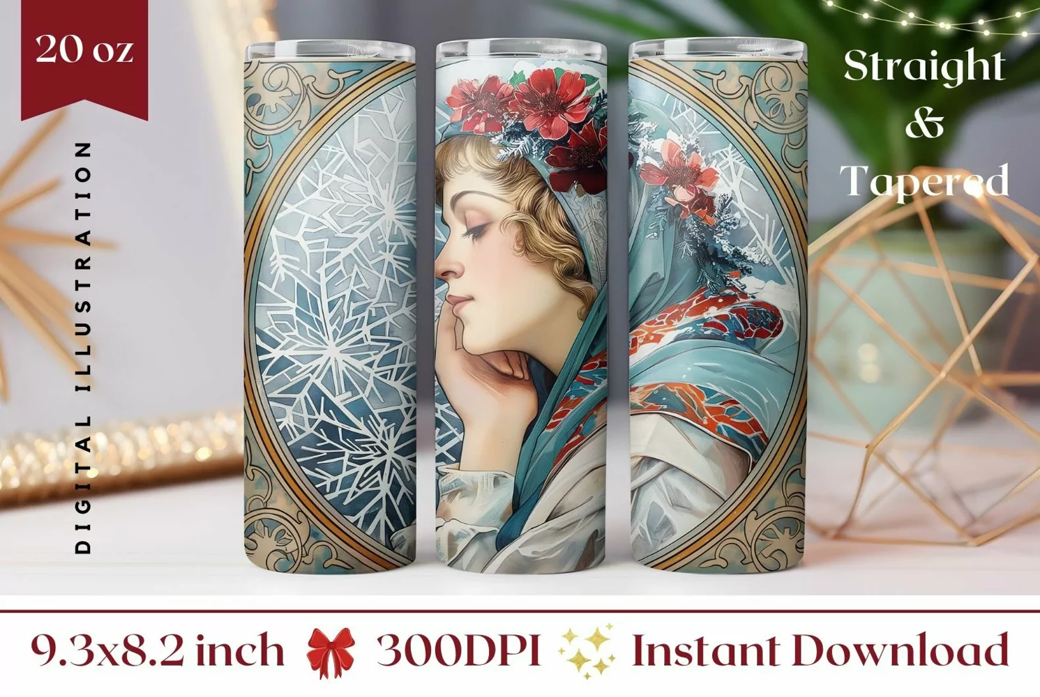 Christmas Sublimation Tumbler Wrap. Colorful sublimation design with Christmas Girl in Winter Forest.