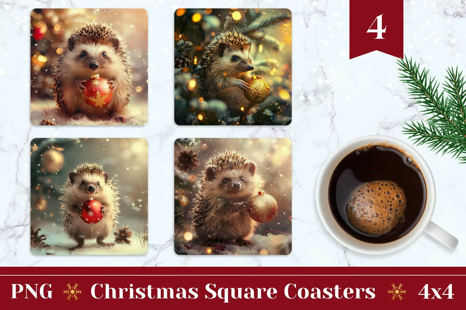 Cute Christmas Hedgehog Square Coasters, Christmas Animals example image 1