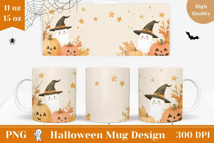 Halloween Pumpkins Mug Wrap, Kawaii Ghost Mug PNG example image 1