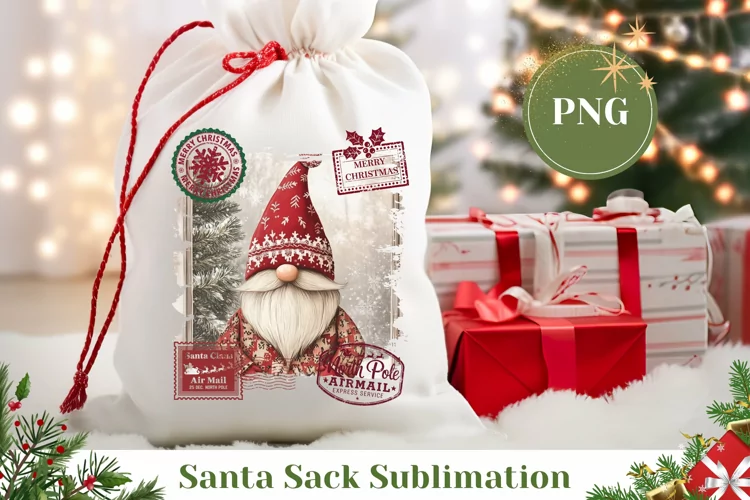 Christmas Gnome Santa Sack Print, Christmas Gift Bag