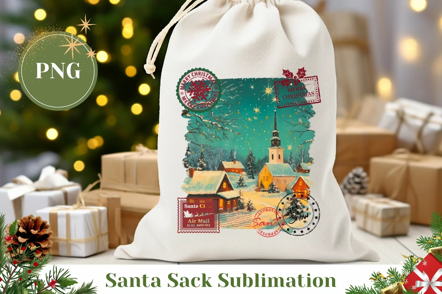 Christmas Village Santa Sack Sublimation, Christmas Gift Bag
