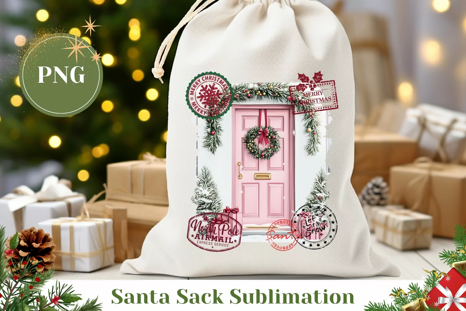 Christmas Pink Door Santa Sack, Christmas Gift Bag Design example image 1
