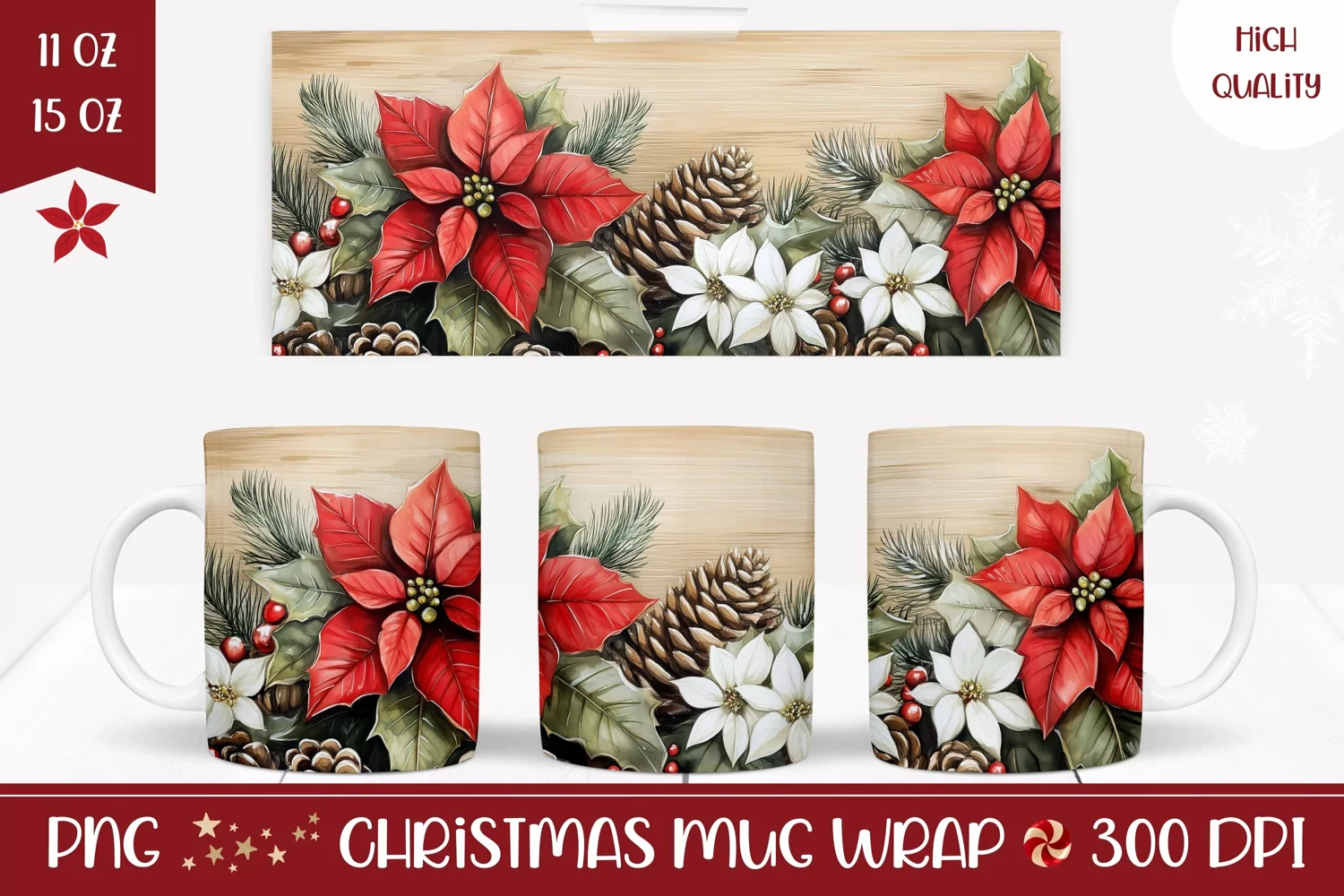 Poinsettia Mug Wrap Design, Christmas Mug Sublimation