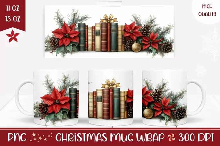 Books Mug Wrap Design, Christmas Coffee Mug Design