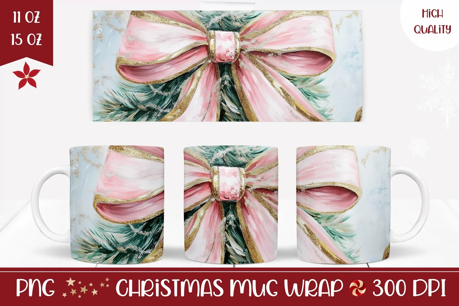 Watercolor Christmas Mug Wrap, Christmas Ribbon Sublimation