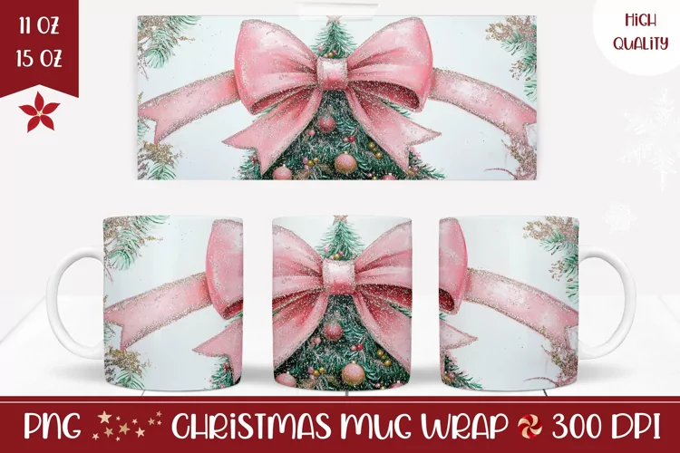 Watercolor Christmas Mug, Pink Christmas Ribbon Sublimation example image 1