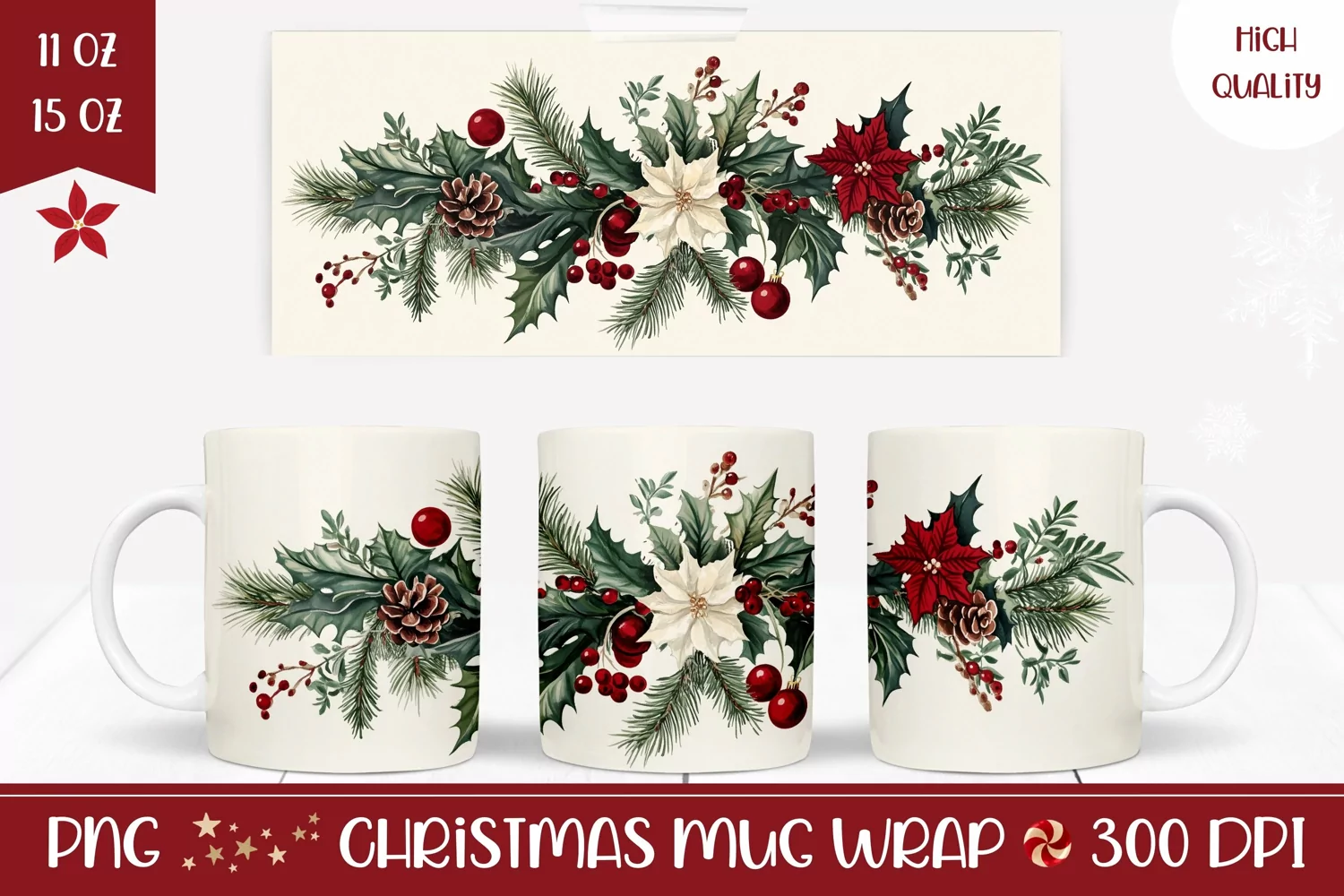 Floral Christmas Mug Wrap, Christmas Poinsettia Mug Design