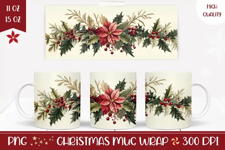 Floral Christmas Mug Wrap, Watercolor Poinsettia Mug Design