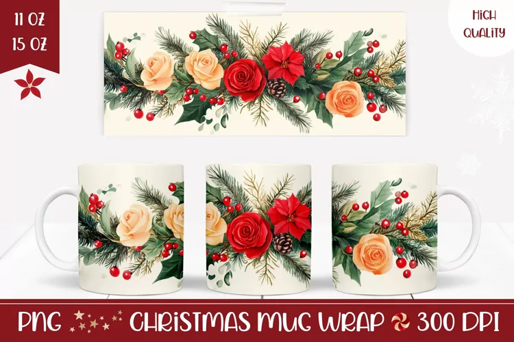 Floral Christmas Mug, Watercolor Flowers Mug Wrap Design