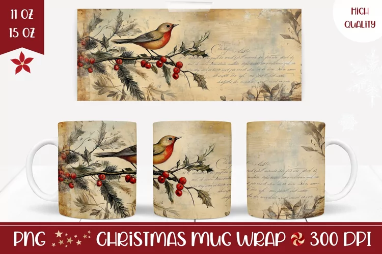 Vintage Christmas Mug Design, Winter Bird Mug Wrap